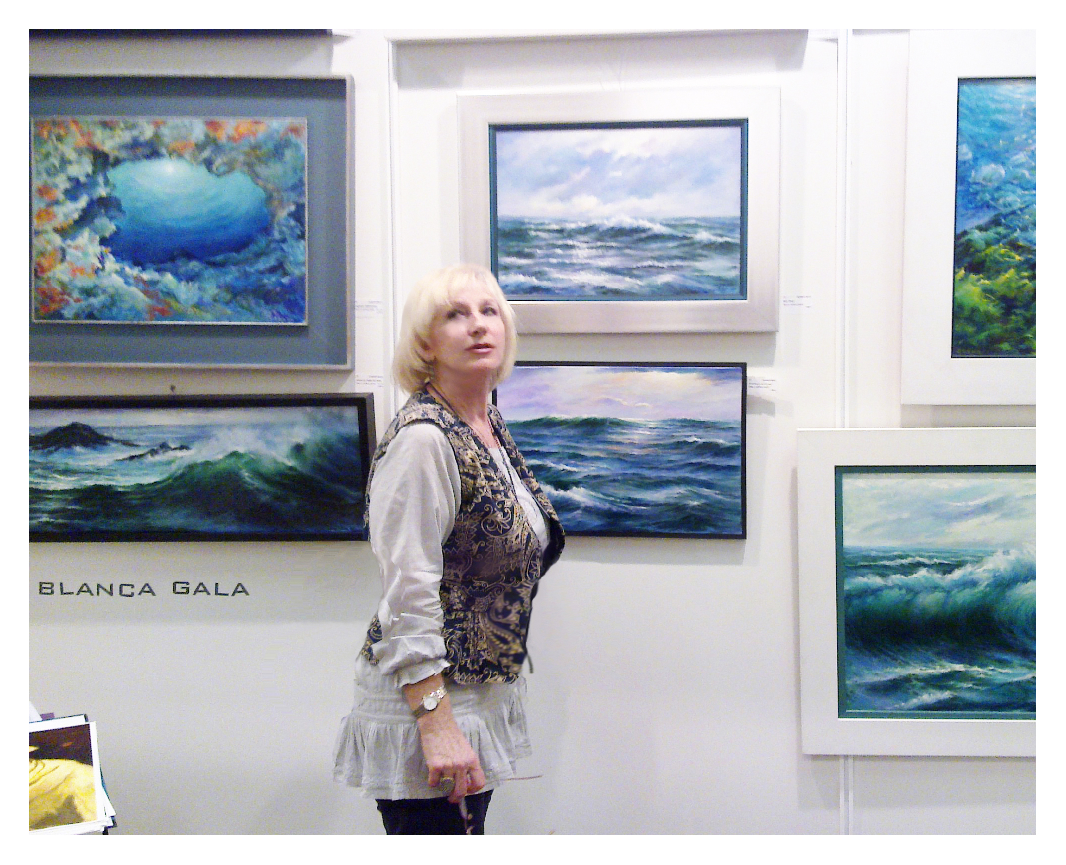 Buscando mostrar, una vez más, su trayectoria artística, la obra de Blanca Gala viaja estos días a Cannes, concretamente al "Palais des Festivals", escenario del famoso Festival Internacional Cinematográfico. La pintora desea compartir sus nuevos logros,dentro de un lógico avance artístico y técnico que los actuales tiempos requieren; pero esta captadora romántica de la realidad sigue imprimiendo a su pintura la humanidad y entrega apasionada, no exenta de la serenidad que cada obra requiere. El "movimiento, luz y color" que determinan su temática primordial, las marinas, nos siguen llegando en rítmicas pinceladas, transmisoras de una creación, en definitiva, armónica y vibrante; logrando cotas de una gran pasión, no exenta de espiritualidad.