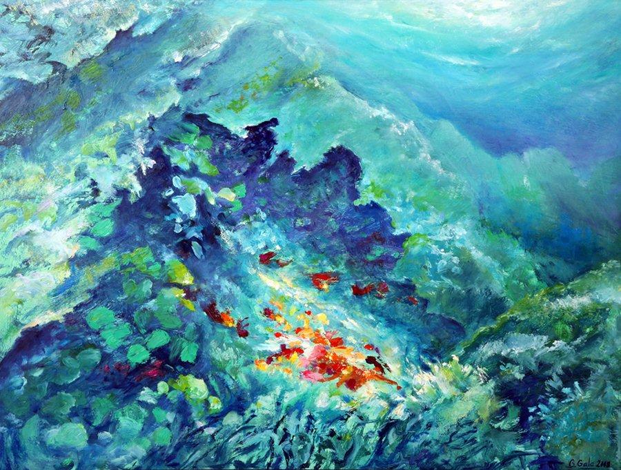 Va discurriendo el verano del 2015, el verano por antonomasia, pues parece ser que hemos soportado las temperaturas más elevadas del último siglo -o casi-, el mes de Julio ha sido totalmente caótico; huimos de la ciudad esperando hallar en el mar un sucedáneo de ensueño y alguna brisita marina que nos dulcificara tanto sofoco, pero... doy fe, tampoco ha resultado ser la panacea. No obstante, la Revista Gal-Art me ofrece la perspectiva de llevarles en su portada un soplo de humedades y colores para atemperar calores y subir, eso sí emociones y ensoñaciones que nos puedan sumergir en un maremágnum de color, agua y vida que atemperen un poquito esta calima inmisericorde y nos acerque a la belleza de ese abaniqueo marino , con una paleta bien repleta de color y movimiento para sentir la emoción de que aún vivimos, soñamos y seguimos esperando, porque el mejor momento de nuestras vidas aún está por llegar; y quizá venga envuelto en un totum revolutum de verdes, azules cobalto y real, esmeraldas y violetas.... Ahí tenéis pues, mi postal de Julio-Agosto, vivificante, destinada a una ensoñación de aguas revueltas -ma non tanto- pero placenteras y refrescantes, como las que yo estoy sintiendo en mi piel estos días en este maravilloso rincón de Cabo de Gata, en la famosa playa de Los Muertos. Energía total, recuperación del ostracismo vivido, pues dentro de unos días mis mares llegarán una vez más a París y no podemos dormirnos, permanecer eternamente arrullados por el vaivén de las olas que nos sonríen estos días..... El Arte se sustenta en la imaginación y la acción; hay que seguir buceando en él buscando, siempre buscando...... Y ya saben, cuando la inspiración llegue, que nos encuentre trabajando.....